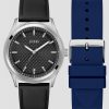 - Black dial with bold hour markers