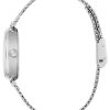 - Square hour markers with crystal accent
