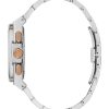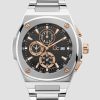 Successful looks start with this luxury timepiece. A silver-tone chronograph watch with matte and brushed elements features multifunction dials, a date window, a black-tone face, rose gold-tone accents and a linked band. Illuminating hands and dial.