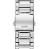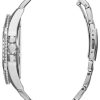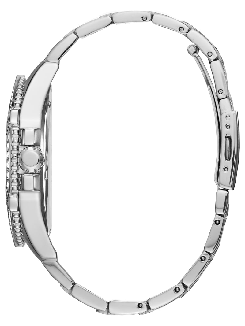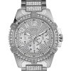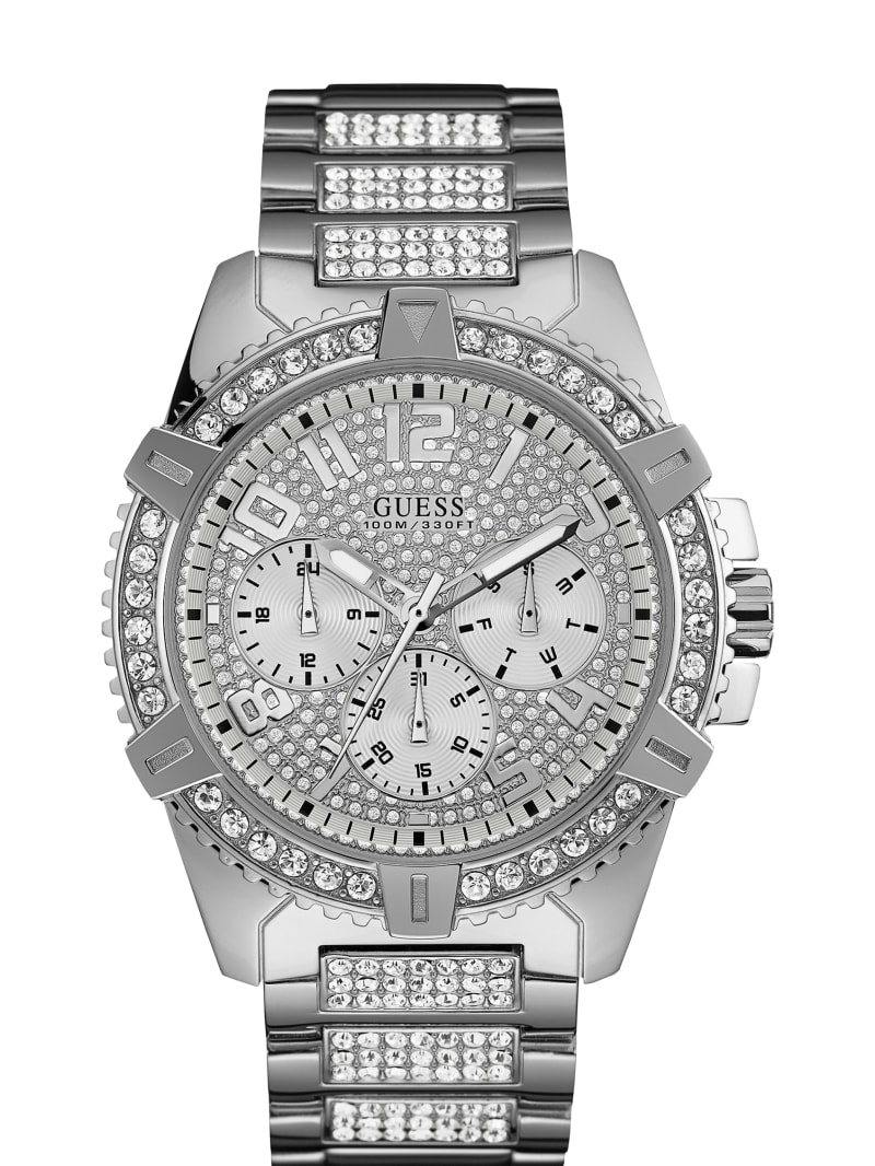This silver-tone watch is complete with a multifunctional design and covered in shimmering crystals.