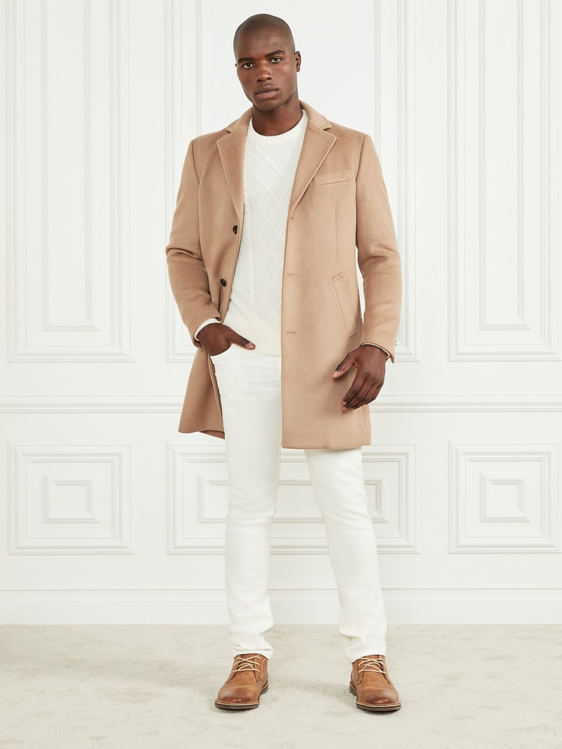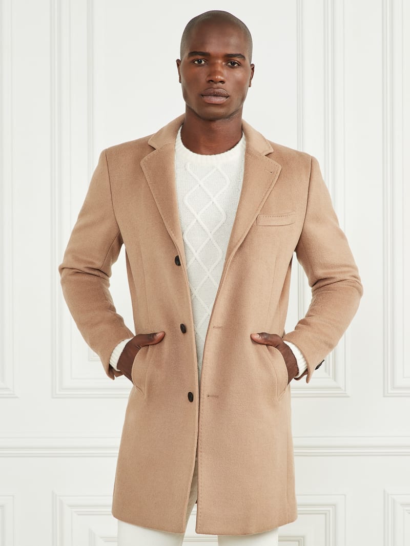 Sharpen your look with this timeless wool-blend coat. Designed with a notched collar, double lapels, dual front pockets, a back vent and large front button closures.