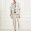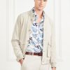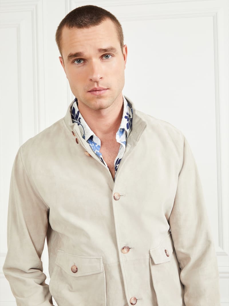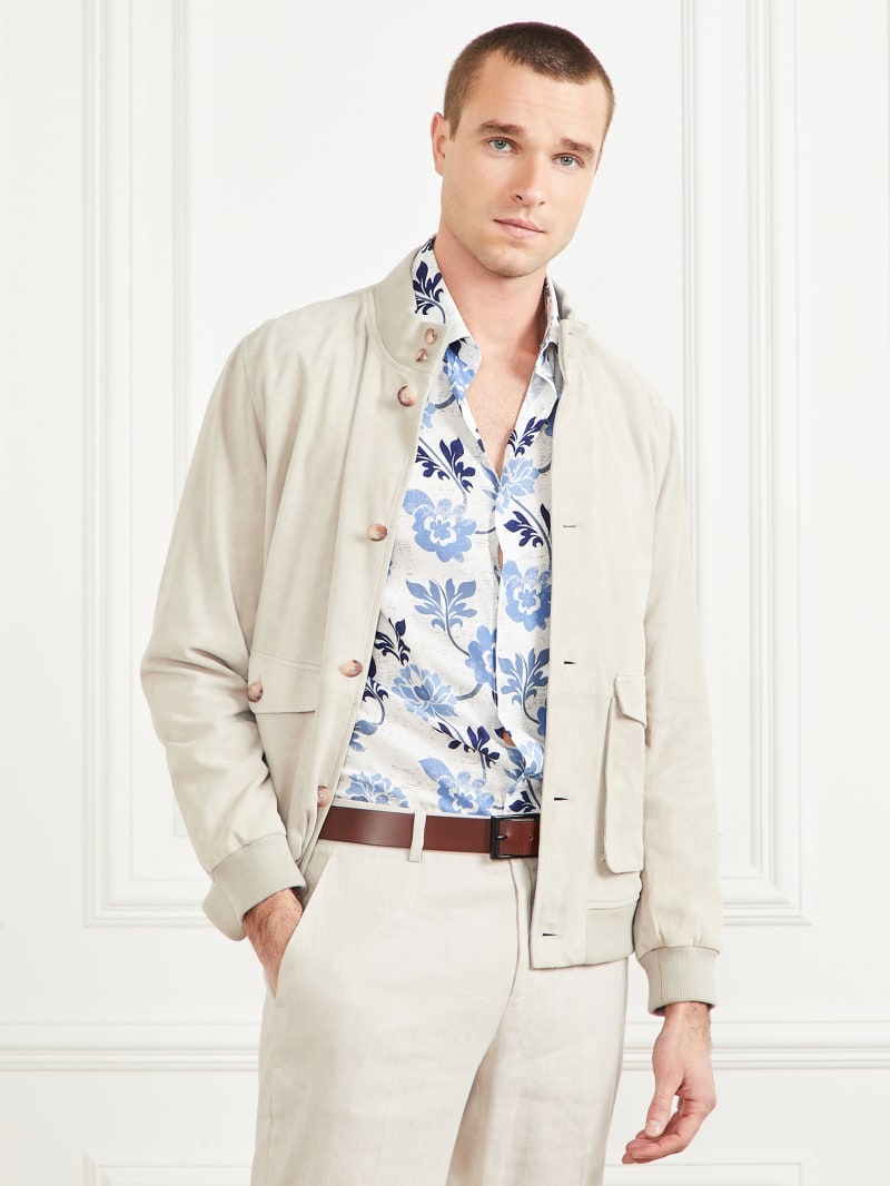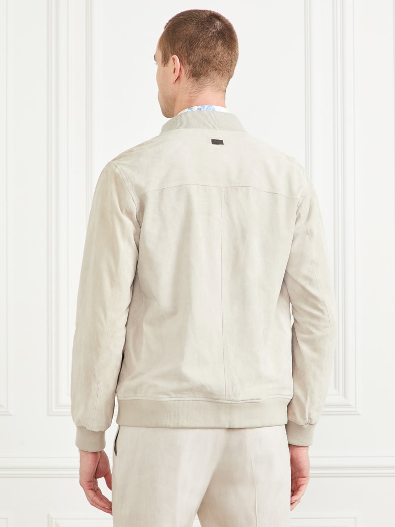 A favorable outerwear addition constructed in a soft genuine suede leather, this flight jacket is designed with ribbed knit trim on the stand collar, sleeve cuffs and bottom hem. Completed by two front fold-over flap pockets and button closures. Lined.