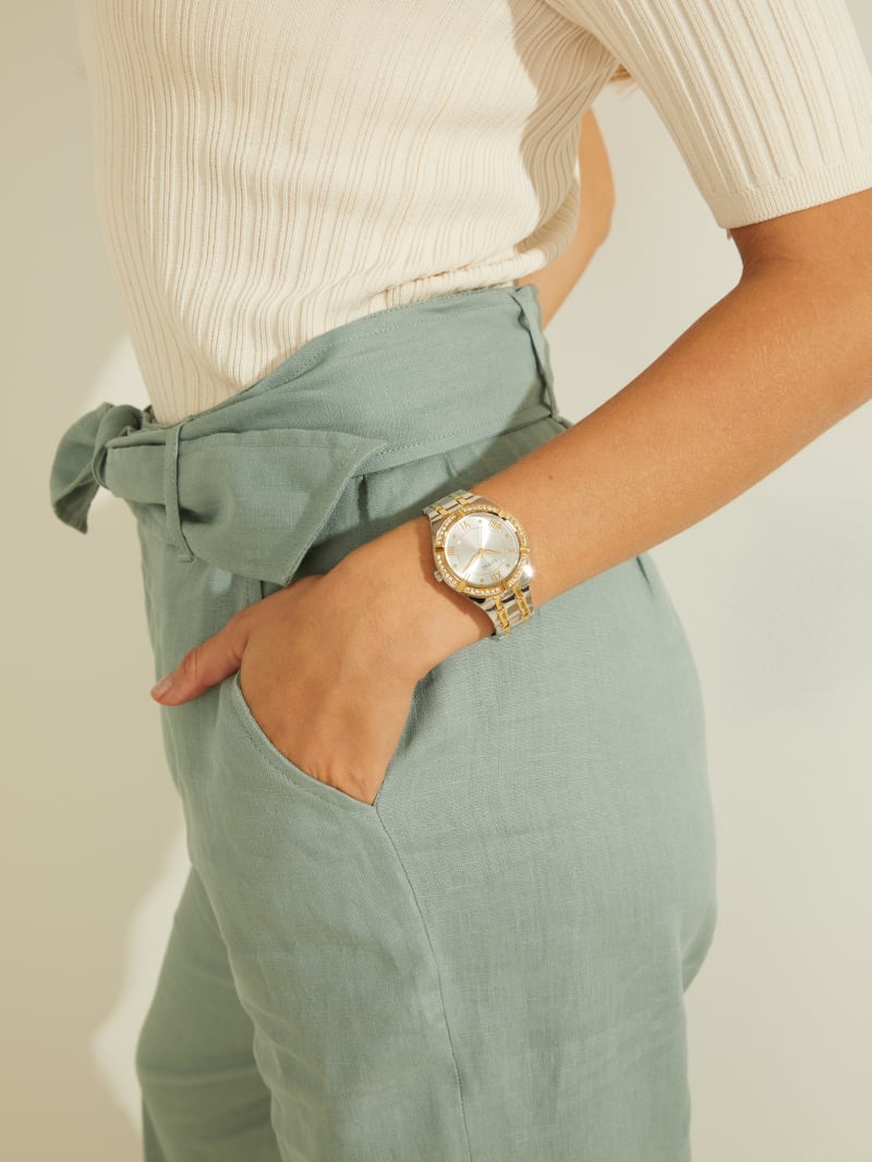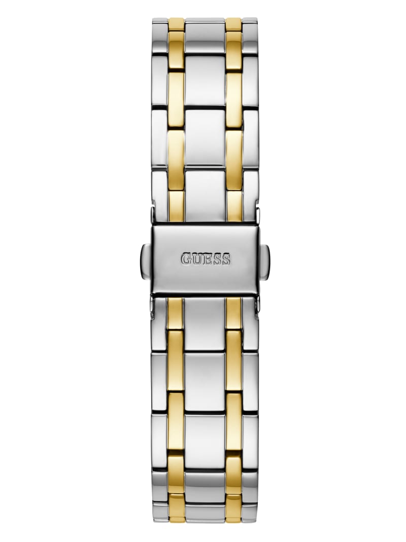 This classic analog timepiece gets a glam update with a two-tone design and crystal encrusted case. Silver and gold-tone polished steel bracelet.