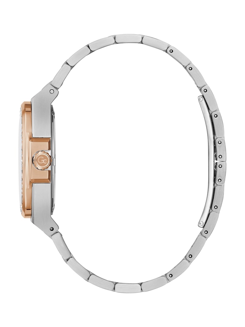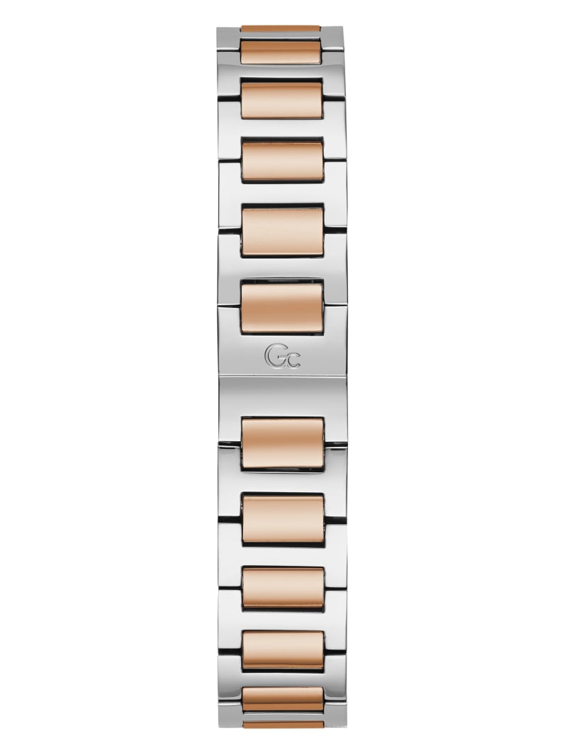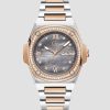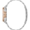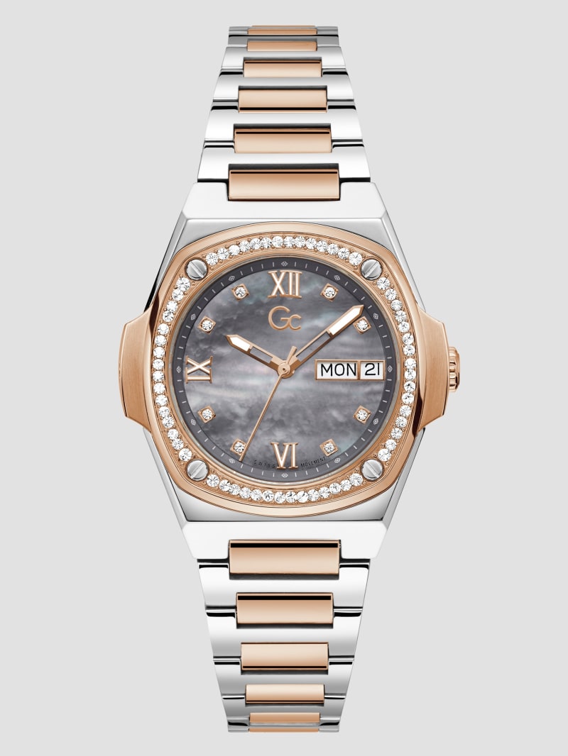 A luxury addition that can’t be passed up. This two-tone analog watch features a silver-tone body with rose gold-tone accents, crystal bezel, date/day windows and a grey mother-of-pearl face with a Roman numeral dial. Linked bracelet.